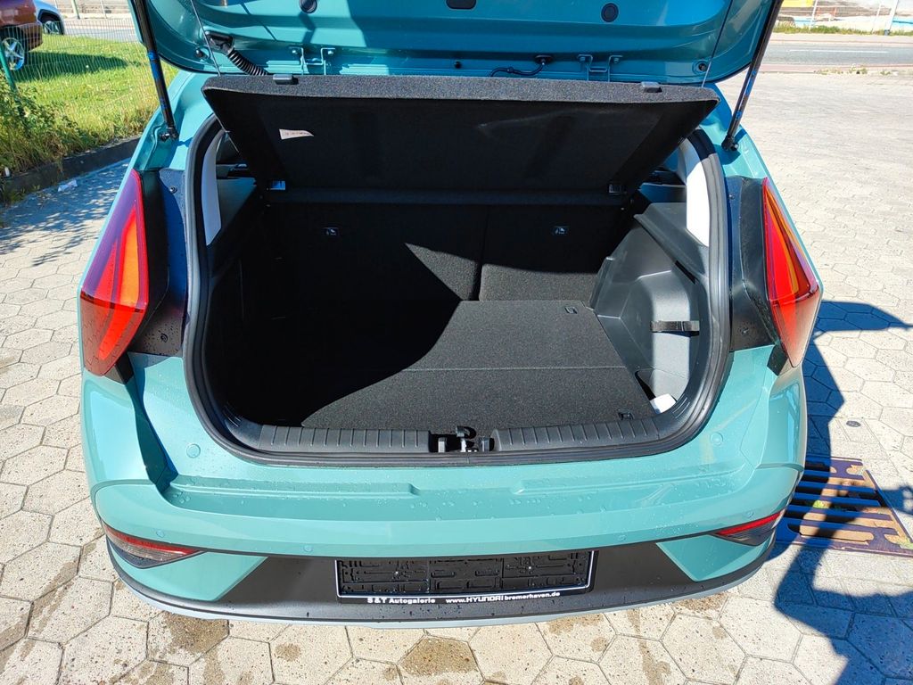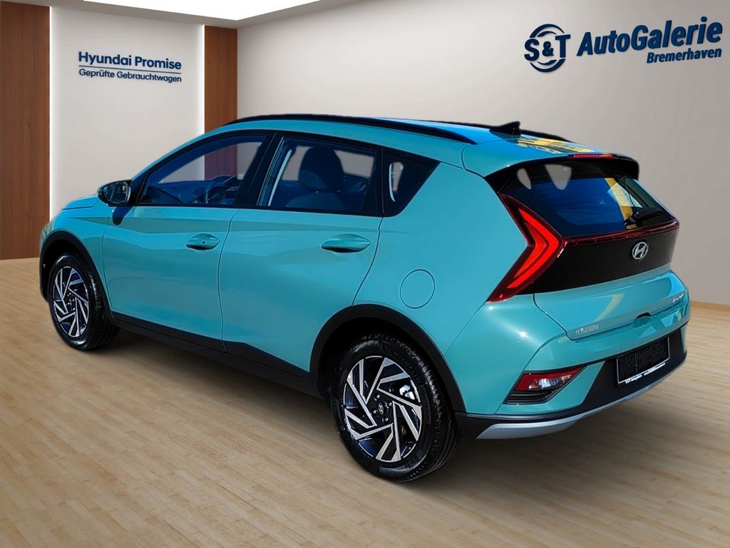 6 Lautsprecher, Airbag Beifahrerseite, Airbag Beifahrerseite abschaltbar, Airbag Fahrerseite, Ambiente-Beleuchtung, Audio-Navigationssystem, Audiosystem: Radio RDS, Außenspiegel elektr. anklappbar, Außenspiegel elektr. verstell- und heizbar, beide, Außenspiegel lackiert, Blinkleuchte in Außenspiegel integriert, Dachspoiler, Digital Cockpit (Instrumentenanzeige Digital), Einparkhilfe hinten, Einschaltautomatik für Fahrlicht / Lichtsensor, Elektron. Stabilitätskontrolle (ESC) mit Bremsassistent, Fahrassistenz-System: aktiver Spurhalteassistent (LKAS, Lane Keep Assist System), Fahrassistenz-System: Aufmerksamkeits-Assistent, Fahrassistenz-System: Autonome Notbremsfunktion inkl. Frontkollisionswarnung (FCA), Fahrassistenz-System: Berganfahrhilfe, Fahrassistenz-System: Fahrprofilauswahl (Drive Mode), Fahrassistenz-System: Fernlichtassistent, Fahrassistenz-System: Insassenalarm (Rear Occopant Alert, ROA), Fahrassistenz-System: Multikollisionsbremse (Multi Collision Brake), Fahrassistenz-System: Sicherheitssystem mit automatischem Notruf (ERA GLONASS / eCall), Fahrassistenz-System: Verkehrszeichenerkennung, erweitert (Geschwindigkeits-Regel-/Begrenzeranlage), Fensterheber elektrisch hinten, Freisprecheinrichtung Bluetooth, Gepäck-/Laderaumleuchte, Gepäckraumabdeckung / Rollo, Getriebe 7-Gang - Doppelkupplungsgetriebe DCT, Gurtstraffer, Heckleuchten LED, Heckscheibe heizbar, Induktionsladeschale für Smartphone, Karosserie: 5-türig, Kopf-Airbag-System, Kopfstützen hinten verstellbar, Kühlergrill schwarz (glanzlackiert), Lenkrad (4-Speichen), Lenkrad heizbar, LM-Felgen, Modellpflege, Motor 1,0 Ltr. - 74 kW TGDI KAT, Otto-Partikelfilter (OPF), Radioempfang digital (DAB+), Radstand 2580 mm, Reifen-Reparaturkit, Reifendruck-Kontrollsystem, Rückfahrkamera, Rücksitzlehne geteilt/klappbar, Schadstoffarm nach Abgasnorm Euro 6e, Schalt-/Wählhebelgriff Leder, Scheinwerfer LED, Seitenairbag vorn, Service-System: Online Update OTA (Over The Air), Service-System: Remote Services (Blue Link), Sicherheitsgurte vorn höhenverstellbar, Sitz vorn links höhenverstellbar, Sitzbezug / Polsterung: Stoff, Sitzheizung vorn, Sonnenblenden mit Spiegel (beleuchtet), Start/Stop-Anlage, Steckdose (12V-Anschluß) vorn, Türgriffe außen Wagenfarbe, USB-Anschluss + AUX-IN-Anschluss, USB-Anschluss hinten, USB-Anschluss Mittelkonsole, Verglasung getönt, Warnanlage für Sicherheitsgurte, Fahrer-/Beifahrerseite, Wireless SmartLink (Apple CarPlay)