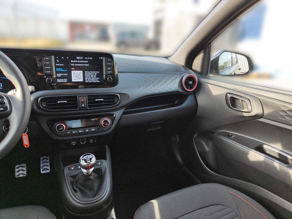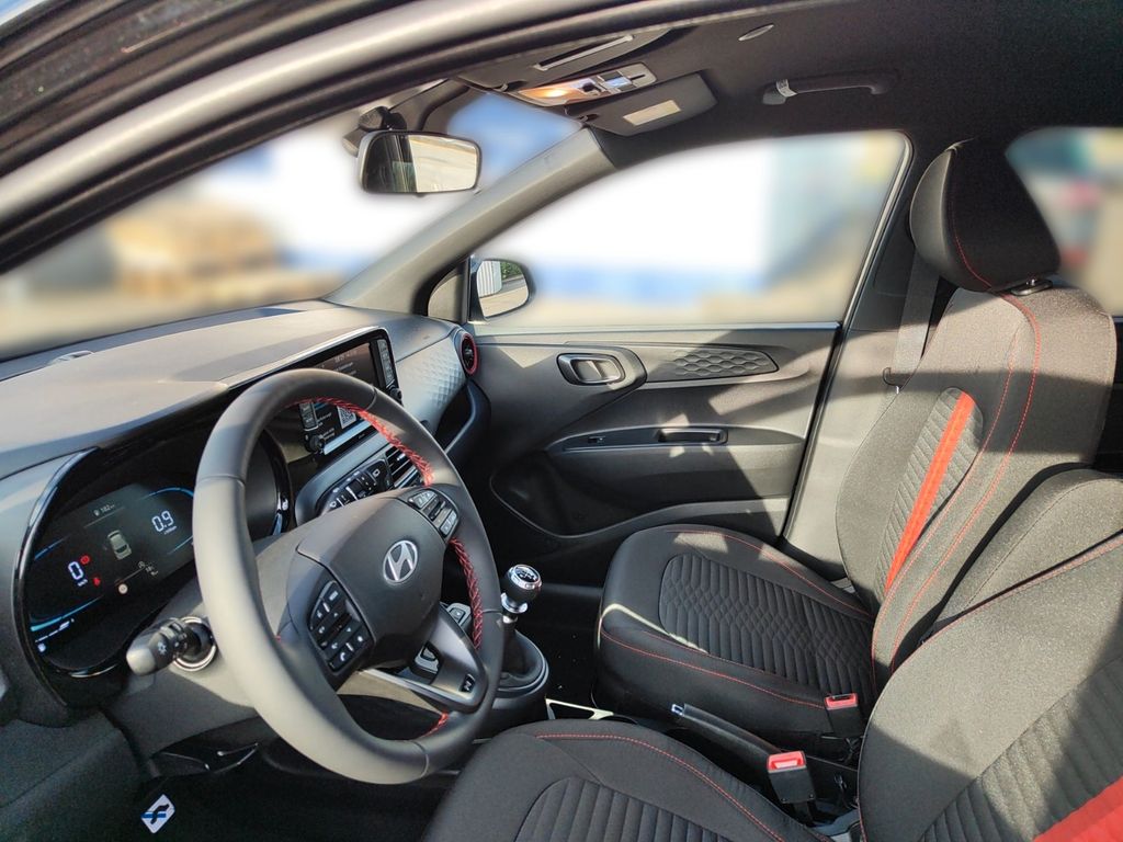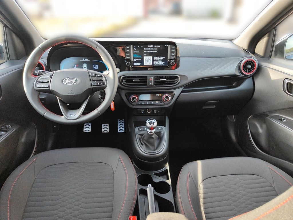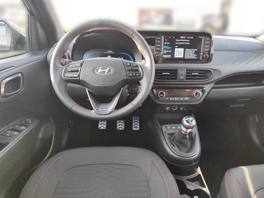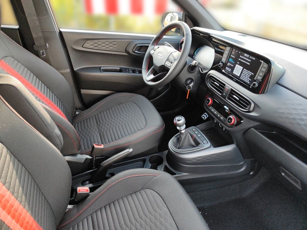 2 Lautsprecher, 3. Bremsleuchte, Ablagebox / Stauraum unter Kofferraumboden, Airbag Beifahrerseite, Airbag Beifahrerseite abschaltbar, Airbag Fahrerseite, Aktives Bremslicht (ESS), Audiobedienung am Lenkrad, Audiosystem: Radio RDS, Außenspiegel elektr. anklappbar, Außenspiegel elektr. verstell- und heizbar, beide, Außenspiegel Phantom Black, Blinkleuchte in Außenspiegel integriert, Bordcomputer, Bordcomputer mit TFT-Farbdisplay, hochauflösend, Dachhimmel schwarz, Dachspoiler, Design- und Ausstattungslinie N Line, Einparkhilfe hinten, Einschaltautomatik für Fahrlicht / Lichtsensor, Elektron. Stabilitätskontrolle (ESC) mit Bremsassistent, Fahrassistenz-System: aktiver Spurhalteassistent (LKAS, Lane Keep Assist System), Fahrassistenz-System: Aufmerksamkeits-Assistent, Fahrassistenz-System: Autonome Notbremsfunktion inkl. Frontkollisionswarnung (FCA), Fahrassistenz-System: Berganfahrhilfe, Fahrassistenz-System: Fernlichtassistent, Fahrassistenz-System: Sicherheitssystem mit automatischem Notruf (ERA GLONASS / eCall), Fahrassistenz-System: Verkehrszeichenerkennung, erweitert (Geschwindigkeits-Regel-/Begrenzeranlage), Fensterheber elektrisch hinten, Freisprecheinrichtung Bluetooth, Gepäck-/Laderaumleuchte, Geschwindigkeits-Begrenzeranlage (Speed-Limiter), Gurtstraffer, Heckleuchten LED, Heckscheibe heizbar, Heckscheibenwischer, Isofix-Aufnahmen für Kindersitz, Karosserie: 5-türig, Komfort-Paket, Kopf-Airbag-System, Kopfstützen hinten verstellbar, Lenkrad heizbar, Lenkrad mit Multifunktion, Lenksäule (Lenkrad) höhenverstellbar, LM-Felgen, Modellpflege, Motor 1,0 Ltr. - 66 kW TGDI KAT, Navigationssystem, Nebelschlussleuchte, Otto-Partikelfilter (OPF), Projektor-Scheinwerfer, Radioempfang digital (DAB+), Reifen-Reparaturkit, Reifendruck-Kontrollsystem, Rückfahrkamera, Rücksitzlehne geteilt/klappbar, Schadstoffarm nach Abgasnorm Euro 6e, Schalt-/Wählhebelgriff Leder, Seitenairbag vorn, Service-System: Online Update OTA (Over The Air), Sitz vorn links höhenverstellbar, Sitzbezug / Polsterung: Stoff, Sitzheizung vorn, Smartphone Schnittstelle (Apple CarPlay & Android Auto), Start/Stop-Anlage, Türgriffe außen Wagenfarbe, USB-Anschluss Mittelkonsole, Verglasung hinten abgedunkelt (Privacy Glass), Warnanlage für Sicherheitsgurte, Fahrer-/Beifahrerseite