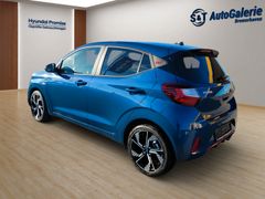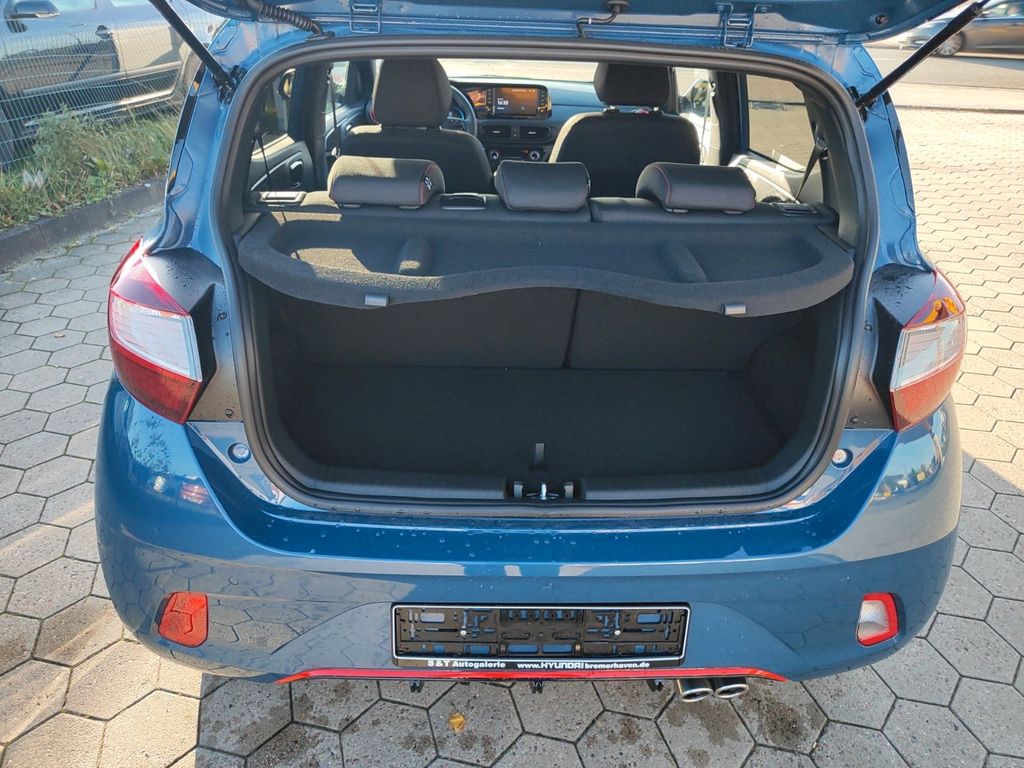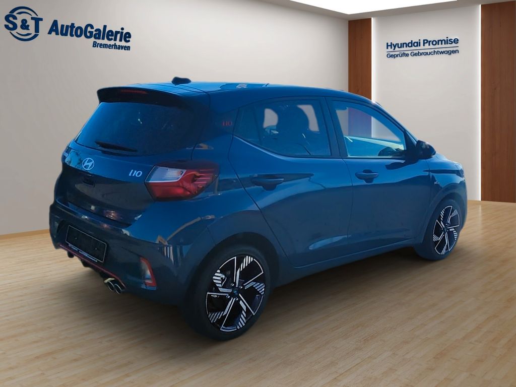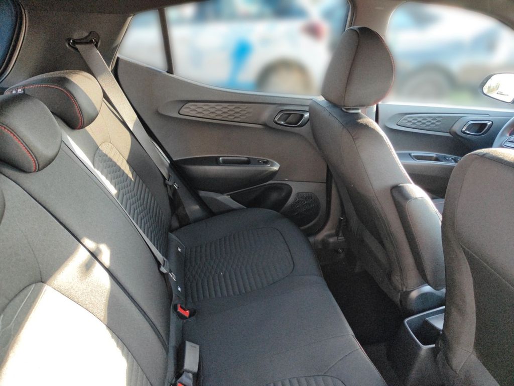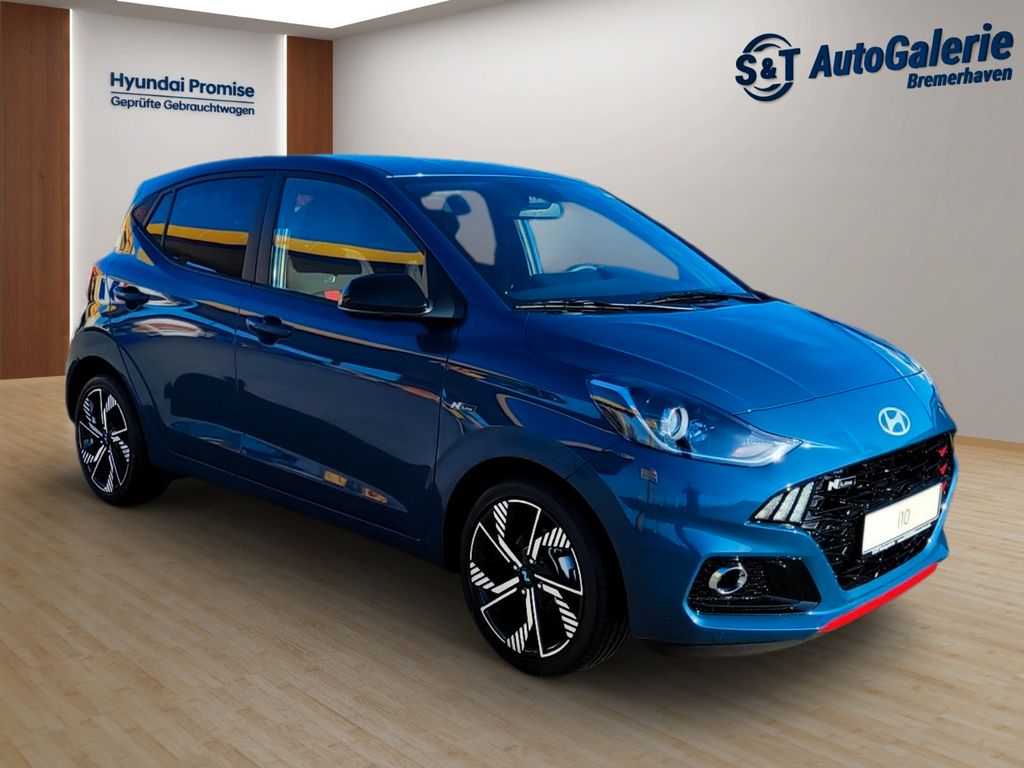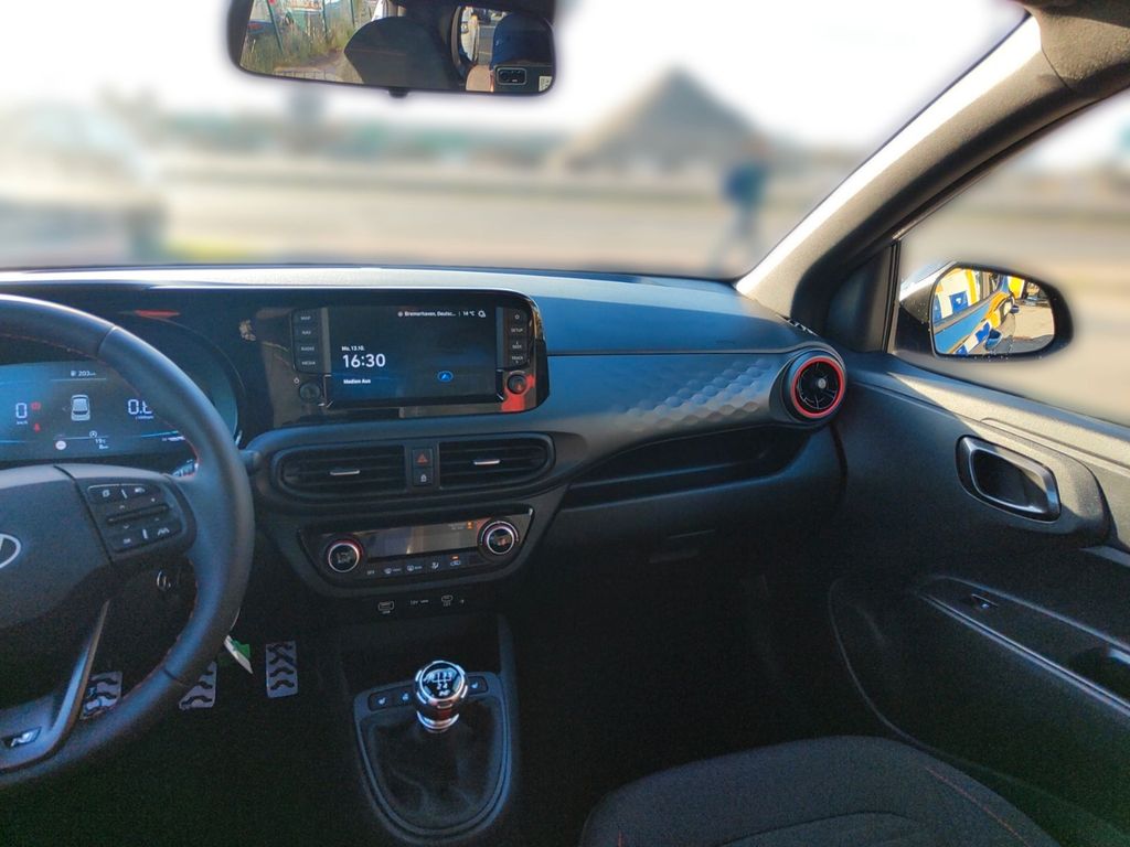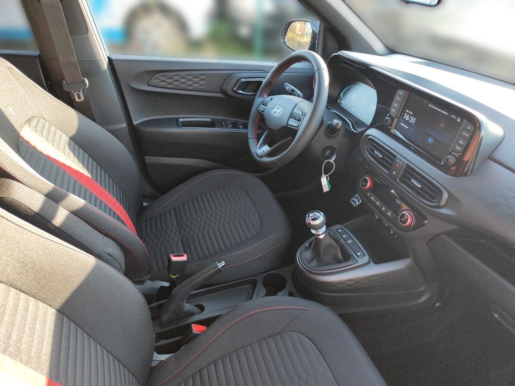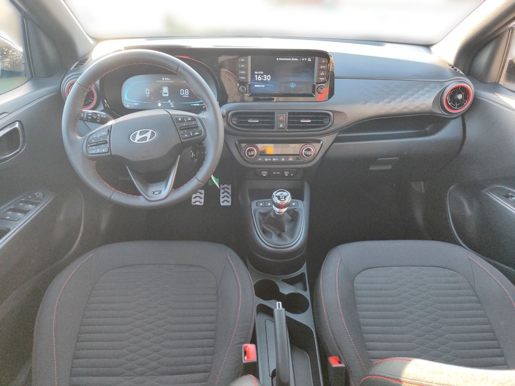 2 Lautsprecher, 3. Bremsleuchte, Ablagebox / Stauraum unter Kofferraumboden, Airbag Beifahrerseite, Airbag Beifahrerseite abschaltbar, Airbag Fahrerseite, Aktives Bremslicht (ESS), Audiobedienung am Lenkrad, Audiosystem: Radio RDS, Außenspiegel elektr. anklappbar, Außenspiegel elektr. verstell- und heizbar, beide, Außenspiegel Phantom Black, Blinkleuchte in Außenspiegel integriert, Bordcomputer, Bordcomputer mit TFT-Farbdisplay, hochauflösend, Dachhimmel schwarz, Dachspoiler, Design- und Ausstattungslinie N Line, Einparkhilfe hinten, Einschaltautomatik für Fahrlicht / Lichtsensor, Elektron. Stabilitätskontrolle (ESC) mit Bremsassistent, Fahrassistenz-System: aktiver Spurhalteassistent (LKAS, Lane Keep Assist System), Fahrassistenz-System: Aufmerksamkeits-Assistent, Fahrassistenz-System: Autonome Notbremsfunktion inkl. Frontkollisionswarnung (FCA), Fahrassistenz-System: Berganfahrhilfe, Fahrassistenz-System: Fernlichtassistent, Fahrassistenz-System: Sicherheitssystem mit automatischem Notruf (ERA GLONASS / eCall), Fahrassistenz-System: Verkehrszeichenerkennung, erweitert (Geschwindigkeits-Regel-/Begrenzeranlage), Fensterheber elektrisch hinten, Freisprecheinrichtung Bluetooth, Gepäck-/Laderaumleuchte, Geschwindigkeits-Begrenzeranlage (Speed-Limiter), Gurtstraffer, Heckleuchten LED, Heckscheibe heizbar, Heckscheibenwischer, Isofix-Aufnahmen für Kindersitz, Karosserie: 5-türig, Komfort-Paket, Kopf-Airbag-System, Kopfstützen hinten verstellbar, Lenkrad heizbar, Lenkrad mit Multifunktion, Lenksäule (Lenkrad) höhenverstellbar, LM-Felgen, Modellpflege, Motor 1,0 Ltr. - 66 kW TGDI KAT, Navigationssystem, Nebelschlussleuchte, Otto-Partikelfilter (OPF), Projektor-Scheinwerfer, Radioempfang digital (DAB+), Reifen-Reparaturkit, Reifendruck-Kontrollsystem, Rückfahrkamera, Rücksitzlehne geteilt/klappbar, Schadstoffarm nach Abgasnorm Euro 6e, Schalt-/Wählhebelgriff Leder, Seitenairbag vorn, Service-System: Online Update OTA (Over The Air), Sitz vorn links höhenverstellbar, Sitzbezug / Polsterung: Stoff, Sitzheizung vorn, Smartphone Schnittstelle (Apple CarPlay & Android Auto), Start/Stop-Anlage, Türgriffe außen Wagenfarbe, USB-Anschluss Mittelkonsole, Verglasung hinten abgedunkelt (Privacy Glass), Warnanlage für Sicherheitsgurte, Fahrer-/Beifahrerseite
