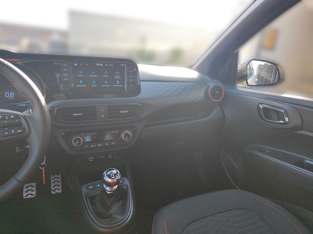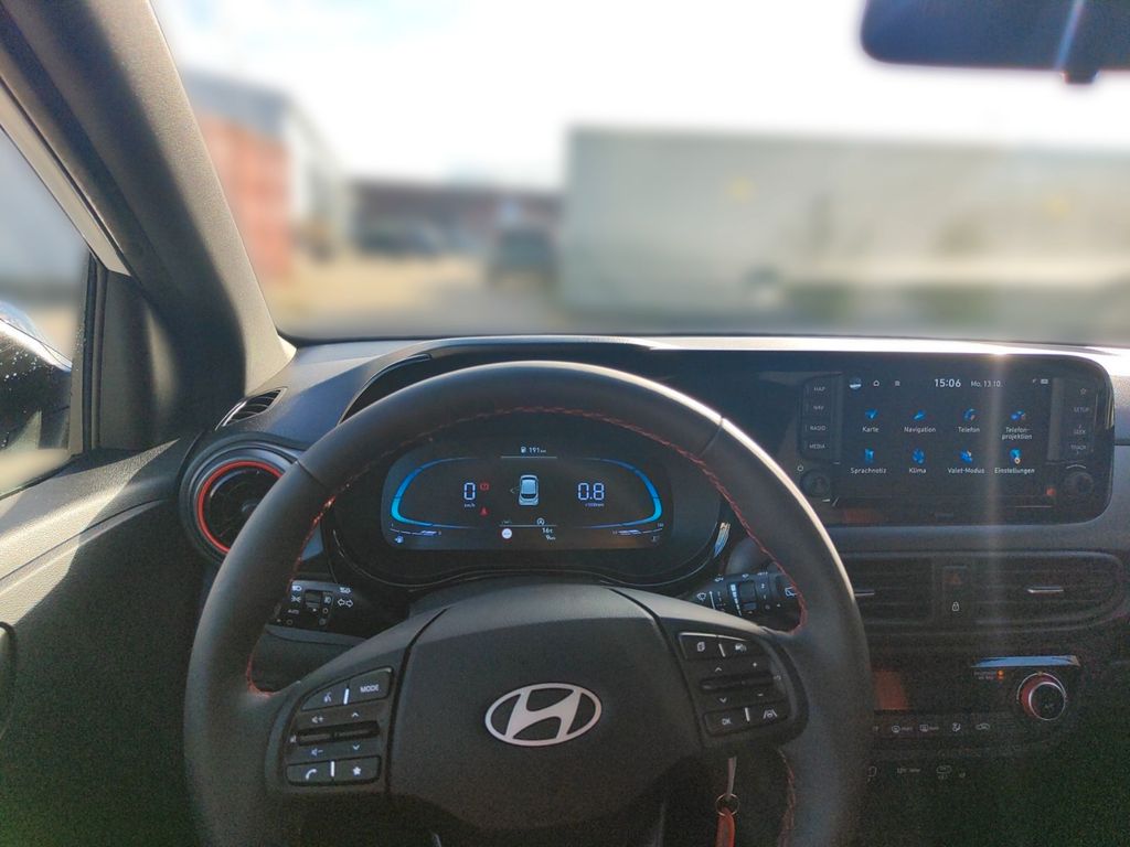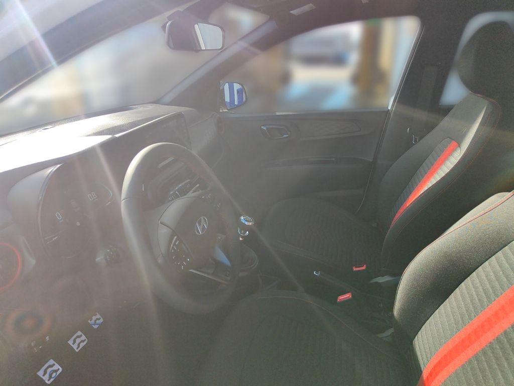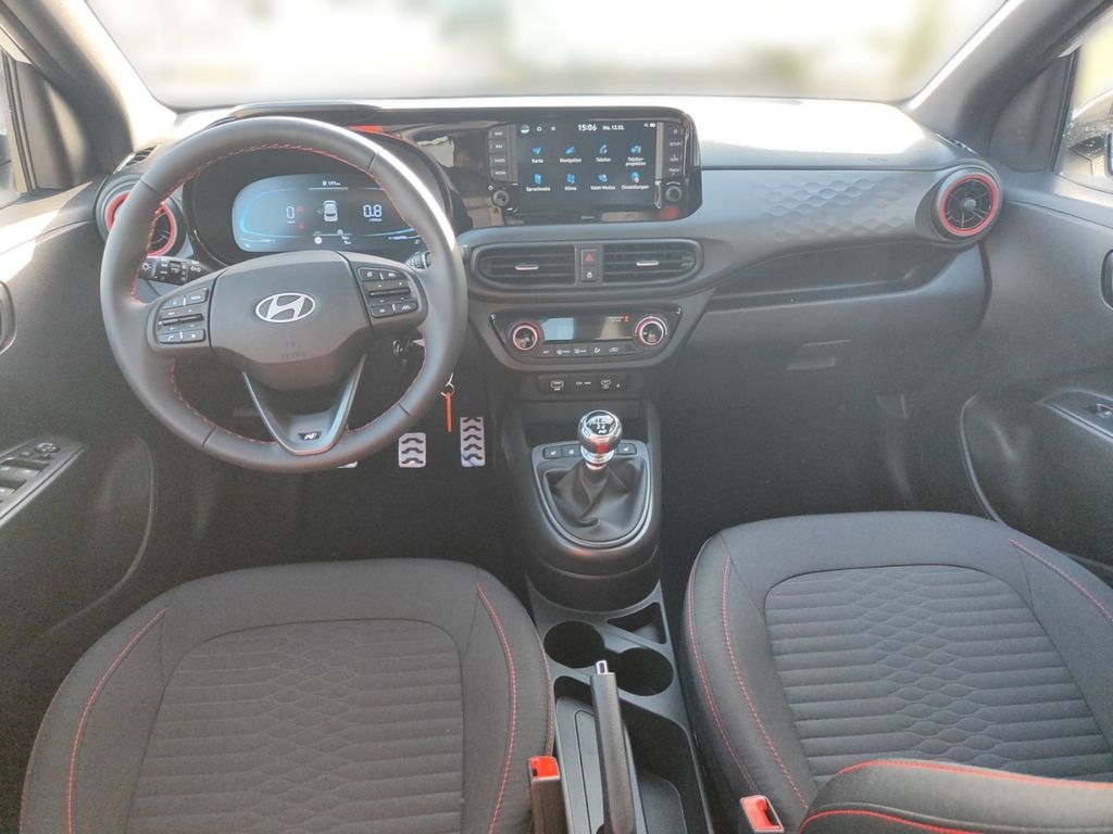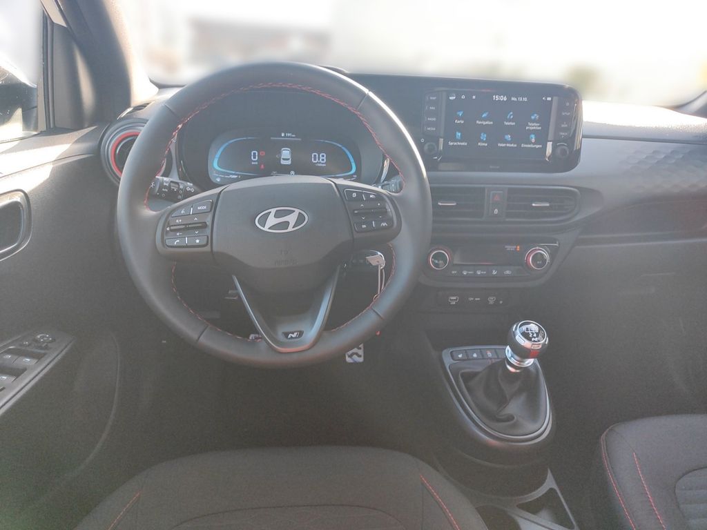 2 Lautsprecher, 3. Bremsleuchte, Ablagebox / Stauraum unter Kofferraumboden, Airbag Beifahrerseite, Airbag Beifahrerseite abschaltbar, Airbag Fahrerseite, Aktives Bremslicht (ESS), Audiobedienung am Lenkrad, Audiosystem: Radio RDS, Außenspiegel elektr. anklappbar, Außenspiegel elektr. verstell- und heizbar, beide, Außenspiegel Phantom Black, Blinkleuchte in Außenspiegel integriert, Bordcomputer, Bordcomputer mit TFT-Farbdisplay, hochauflösend, Dachhimmel schwarz, Dachspoiler, Design- und Ausstattungslinie N Line, Einparkhilfe hinten, Einschaltautomatik für Fahrlicht / Lichtsensor, Elektron. Stabilitätskontrolle (ESC) mit Bremsassistent, Fahrassistenz-System: aktiver Spurhalteassistent (LKAS, Lane Keep Assist System), Fahrassistenz-System: Aufmerksamkeits-Assistent, Fahrassistenz-System: Autonome Notbremsfunktion inkl. Frontkollisionswarnung (FCA), Fahrassistenz-System: Berganfahrhilfe, Fahrassistenz-System: Fernlichtassistent, Fahrassistenz-System: Sicherheitssystem mit automatischem Notruf (ERA GLONASS / eCall), Fahrassistenz-System: Verkehrszeichenerkennung, erweitert (Geschwindigkeits-Regel-/Begrenzeranlage), Fensterheber elektrisch hinten, Freisprecheinrichtung Bluetooth, Gepäck-/Laderaumleuchte, Geschwindigkeits-Begrenzeranlage (Speed-Limiter), Gurtstraffer, Heckleuchten LED, Heckscheibe heizbar, Heckscheibenwischer, Isofix-Aufnahmen für Kindersitz, Karosserie: 5-türig, Komfort-Paket, Kopf-Airbag-System, Kopfstützen hinten verstellbar, Lenkrad heizbar, Lenkrad mit Multifunktion, Lenksäule (Lenkrad) höhenverstellbar, LM-Felgen, Modellpflege, Motor 1,0 Ltr. - 66 kW TGDI KAT, Navigationssystem, Nebelschlussleuchte, Otto-Partikelfilter (OPF), Projektor-Scheinwerfer, Radioempfang digital (DAB+), Reifen-Reparaturkit, Reifendruck-Kontrollsystem, Rückfahrkamera, Rücksitzlehne geteilt/klappbar, Schadstoffarm nach Abgasnorm Euro 6e, Schalt-/Wählhebelgriff Leder, Seitenairbag vorn, Service-System: Online Update OTA (Over The Air), Sitz vorn links höhenverstellbar, Sitzbezug / Polsterung: Stoff, Sitzheizung vorn, Smartphone Schnittstelle (Apple CarPlay & Android Auto), Start/Stop-Anlage, Türgriffe außen Wagenfarbe, USB-Anschluss Mittelkonsole, Verglasung hinten abgedunkelt (Privacy Glass), Warnanlage für Sicherheitsgurte, Fahrer-/Beifahrerseite