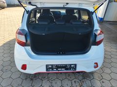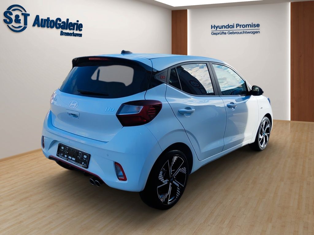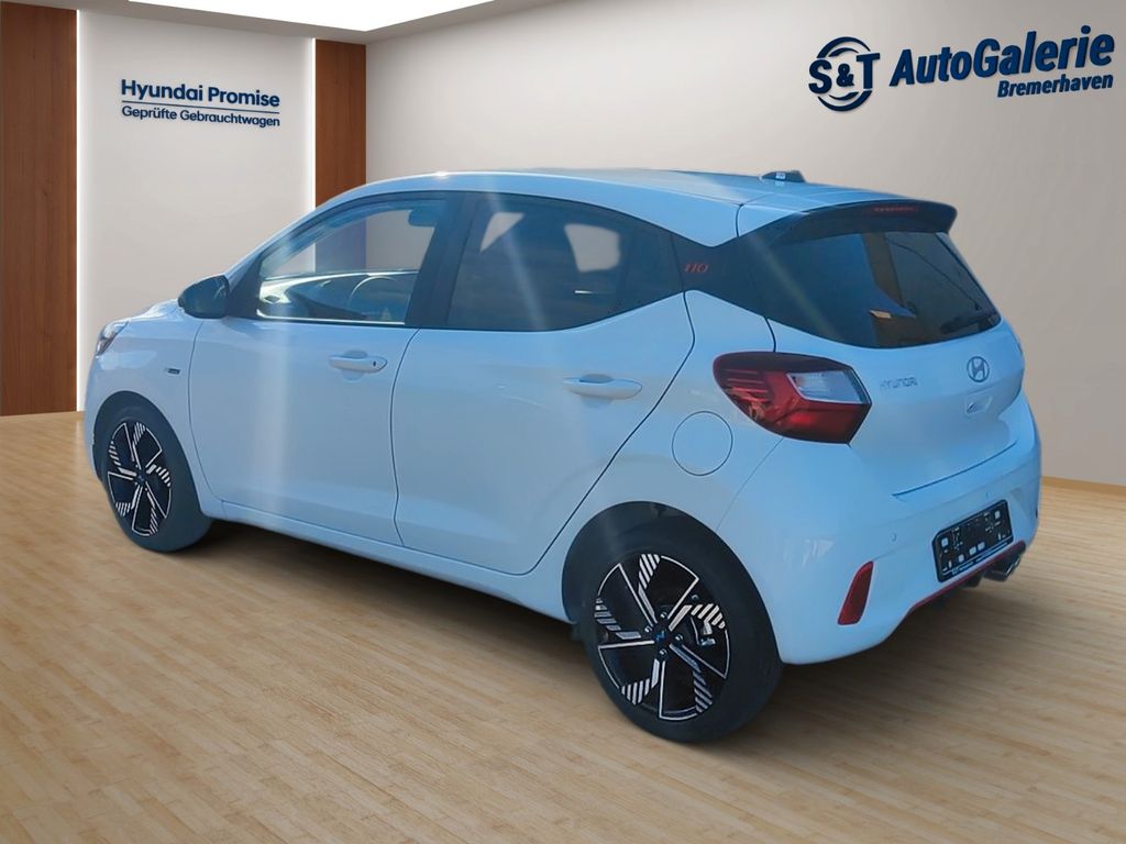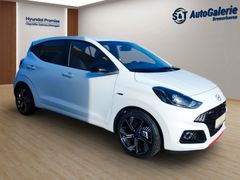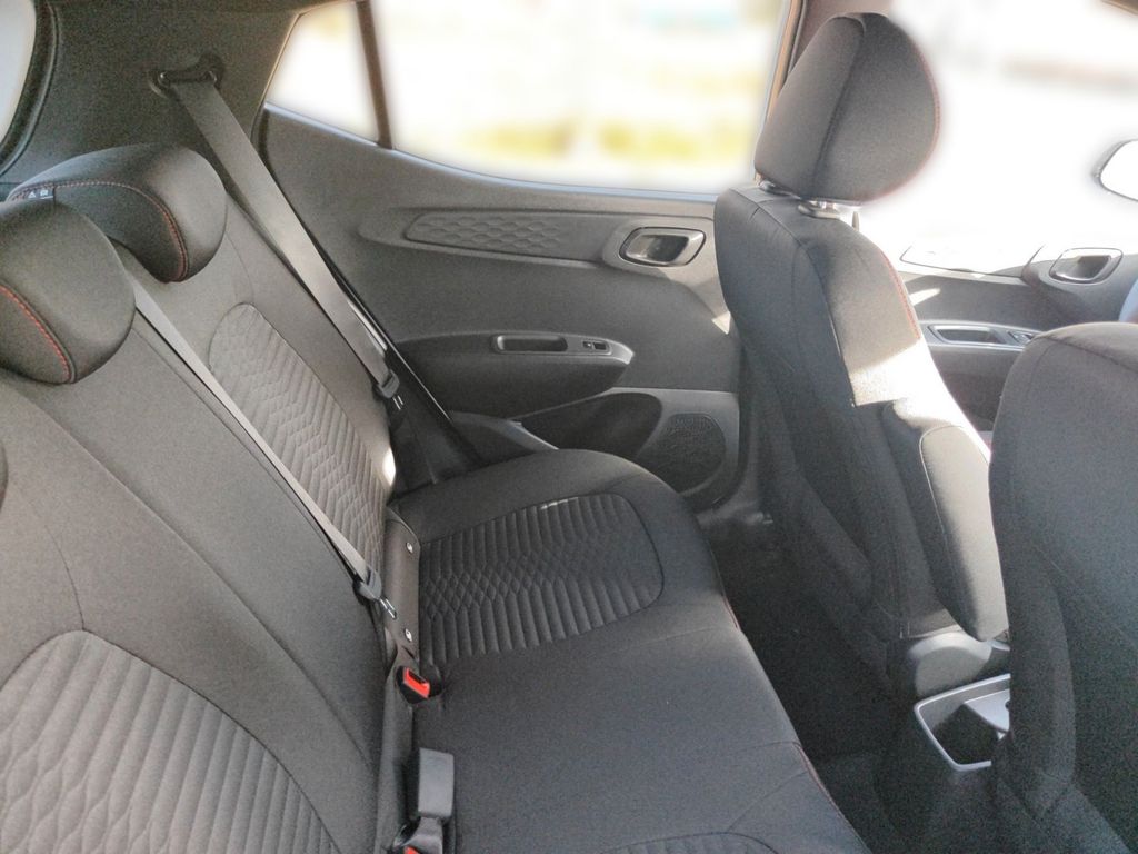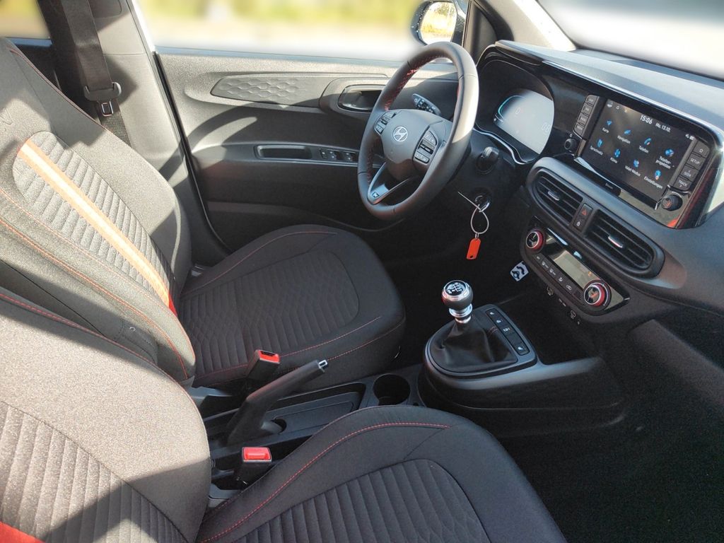 2 Lautsprecher, 3. Bremsleuchte, Ablagebox / Stauraum unter Kofferraumboden, Airbag Beifahrerseite, Airbag Beifahrerseite abschaltbar, Airbag Fahrerseite, Aktives Bremslicht (ESS), Audiobedienung am Lenkrad, Audiosystem: Radio RDS, Außenspiegel elektr. anklappbar, Außenspiegel elektr. verstell- und heizbar, beide, Außenspiegel Phantom Black, Blinkleuchte in Außenspiegel integriert, Bordcomputer, Bordcomputer mit TFT-Farbdisplay, hochauflösend, Dachhimmel schwarz, Dachspoiler, Design- und Ausstattungslinie N Line, Einparkhilfe hinten, Einschaltautomatik für Fahrlicht / Lichtsensor, Elektron. Stabilitätskontrolle (ESC) mit Bremsassistent, Fahrassistenz-System: aktiver Spurhalteassistent (LKAS, Lane Keep Assist System), Fahrassistenz-System: Aufmerksamkeits-Assistent, Fahrassistenz-System: Autonome Notbremsfunktion inkl. Frontkollisionswarnung (FCA), Fahrassistenz-System: Berganfahrhilfe, Fahrassistenz-System: Fernlichtassistent, Fahrassistenz-System: Sicherheitssystem mit automatischem Notruf (ERA GLONASS / eCall), Fahrassistenz-System: Verkehrszeichenerkennung, erweitert (Geschwindigkeits-Regel-/Begrenzeranlage), Fensterheber elektrisch hinten, Freisprecheinrichtung Bluetooth, Gepäck-/Laderaumleuchte, Geschwindigkeits-Begrenzeranlage (Speed-Limiter), Gurtstraffer, Heckleuchten LED, Heckscheibe heizbar, Heckscheibenwischer, Isofix-Aufnahmen für Kindersitz, Karosserie: 5-türig, Komfort-Paket, Kopf-Airbag-System, Kopfstützen hinten verstellbar, Lenkrad heizbar, Lenkrad mit Multifunktion, Lenksäule (Lenkrad) höhenverstellbar, LM-Felgen, Modellpflege, Motor 1,0 Ltr. - 66 kW TGDI KAT, Navigationssystem, Nebelschlussleuchte, Otto-Partikelfilter (OPF), Projektor-Scheinwerfer, Radioempfang digital (DAB+), Reifen-Reparaturkit, Reifendruck-Kontrollsystem, Rückfahrkamera, Rücksitzlehne geteilt/klappbar, Schadstoffarm nach Abgasnorm Euro 6e, Schalt-/Wählhebelgriff Leder, Seitenairbag vorn, Service-System: Online Update OTA (Over The Air), Sitz vorn links höhenverstellbar, Sitzbezug / Polsterung: Stoff, Sitzheizung vorn, Smartphone Schnittstelle (Apple CarPlay & Android Auto), Start/Stop-Anlage, Türgriffe außen Wagenfarbe, USB-Anschluss Mittelkonsole, Verglasung hinten abgedunkelt (Privacy Glass), Warnanlage für Sicherheitsgurte, Fahrer-/Beifahrerseite