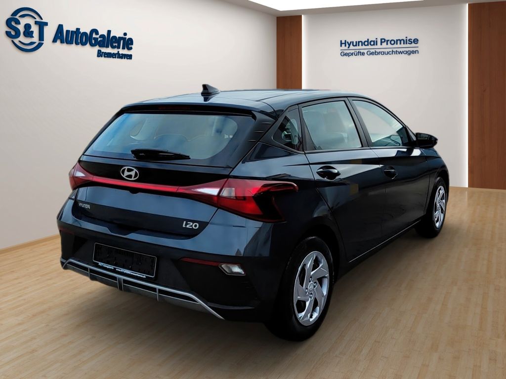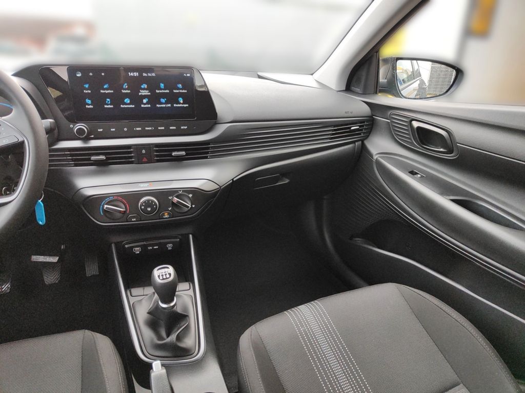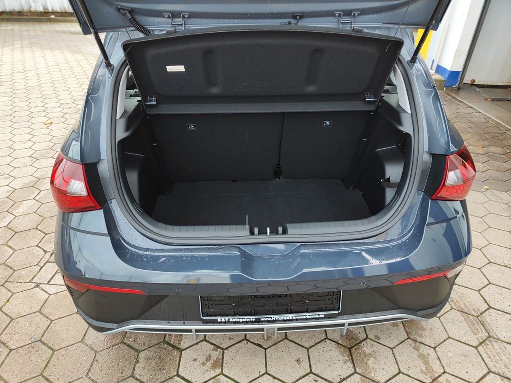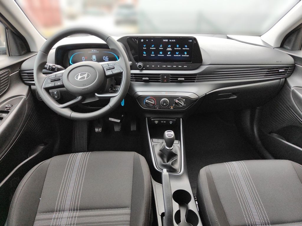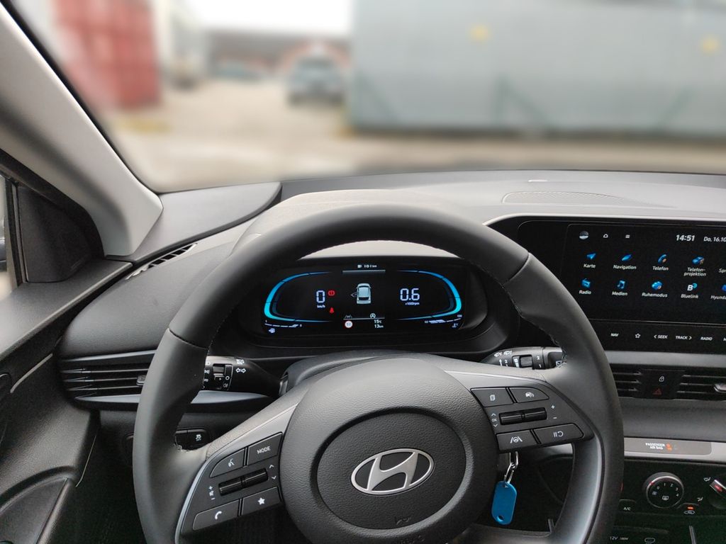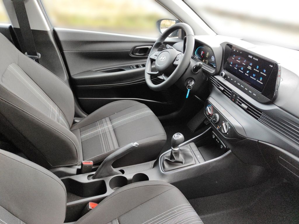 6 Lautsprecher, Airbag Beifahrerseite, Airbag Beifahrerseite abschaltbar, Airbag Fahrerseite, Audio-Navigationssystem, Audiosystem: Radio RDS, Außenspiegel elektr. verstell- und heizbar, beide, Außenspiegel lackiert, Blinkleuchte in Außenspiegel integriert, Bordcomputer, Dachspoiler, Dachspoiler Wagenfarbe, Einparkhilfe hinten, Einschaltautomatik für Fahrlicht / Lichtsensor, Elektron. Stabilitätskontrolle (ESC) mit Bremsassistent, Fahrassistenz-System: aktiver Spurhalteassistent (LKAS, Lane Keep Assist System), Fahrassistenz-System: Aufmerksamkeits-Assistent, Fahrassistenz-System: Autonome Notbremsfunktion inkl. Frontkollisionswarnung (FCA), Fahrassistenz-System: Berganfahrhilfe, Fahrassistenz-System: Fahrprofilauswahl (Drive Mode), Fahrassistenz-System: Fernlichtassistent, Fahrassistenz-System: Insassenalarm (ROA), Fahrassistenz-System: Multikollisionsbremse (Multi Collision Brake), Fahrassistenz-System: Sicherheitssystem mit automatischem Notruf (ERA GLONASS / eCall), Fahrassistenz-System: Verkehrszeichenerkennung, erweitert (Geschwindigkeits-Regel-/Begrenzeranlage), Fahrer-Informations-System (Display 4,2 Zoll), Fensterheber elektrisch hinten, Freisprecheinrichtung Bluetooth, Gepäck-/Laderaumleuchte, Gepäckraumabdeckung / Rollo, Gurtstraffer, Heckscheibe heizbar, Karosserie: 5-türig, Kopf-Airbag-System, Kopfstützen hinten verstellbar, Kühlergrill schwarz (glanzlackiert), Lenkrad (4-Speichen), Lenksäule (Lenkrad) höhenverstellbar, Lenksäule (Lenkrad) längsverstellbar, Modellpflege, Motor 1,0 Ltr. - 74 kW TGDI KAT, Otto-Partikelfilter (OPF), Radioempfang digital (DAB+), Reifen-Reparaturkit, Reifendruck-Kontrollsystem, Rückfahrkamera, Rücksitzlehne geteilt/klappbar, Schadstoffarm nach Abgasnorm Euro 6e, Seitenairbag vorn, Service-System: Remote Services (Blue Link), Sicherheitsgurte vorn höhenverstellbar, Sitz vorn links höhenverstellbar, Sitzbezug / Polsterung: Stoff, Sonnenblenden mit Spiegel, Start/Stop-Anlage, Steckdose (12V-Anschluß) vorn, Türgriffe außen Wagenfarbe, USB-Anschluss (Typ C), USB-Anschluss hinten (Typ C), USB-Anschluss Mittelkonsole, Verglasung getönt, Warnanlage für Sicherheitsgurte, Fahrer-/Beifahrerseite, Wireless SmartLink (Apple CarPlay)